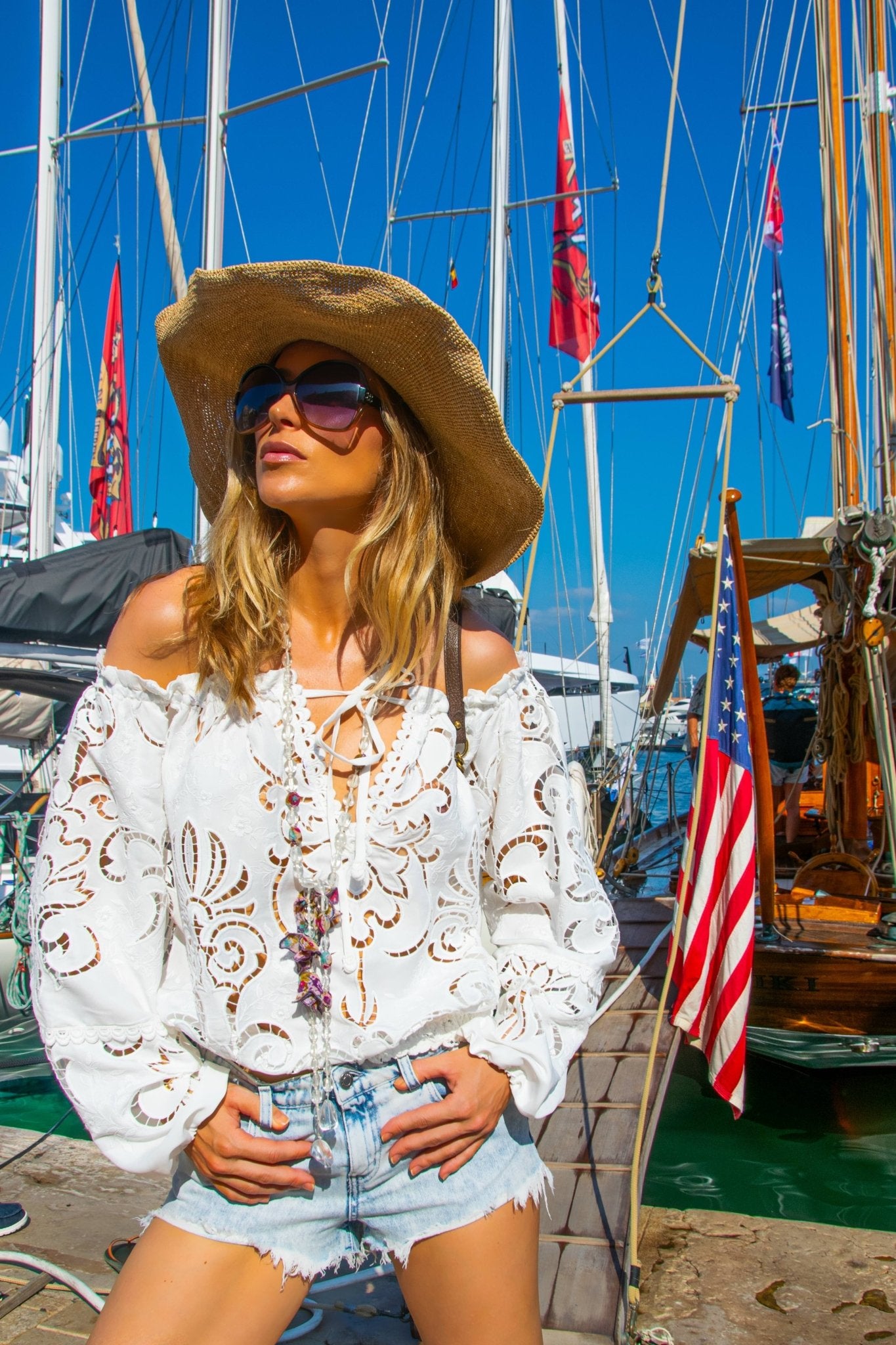 The Rosana Blouse reflects the effortless allure of Riviera style — feminine, airy, and timeless. Crafted from white guipure cotton with intricate openwork embroidery, it features an off-the-shoulder neckline, soft balloon sleeves, and delicate scalloped edges. The adjustable tie front adds a touch of bohemian charm, perfect for pairing with linen shorts or denim for an elevated summer look.