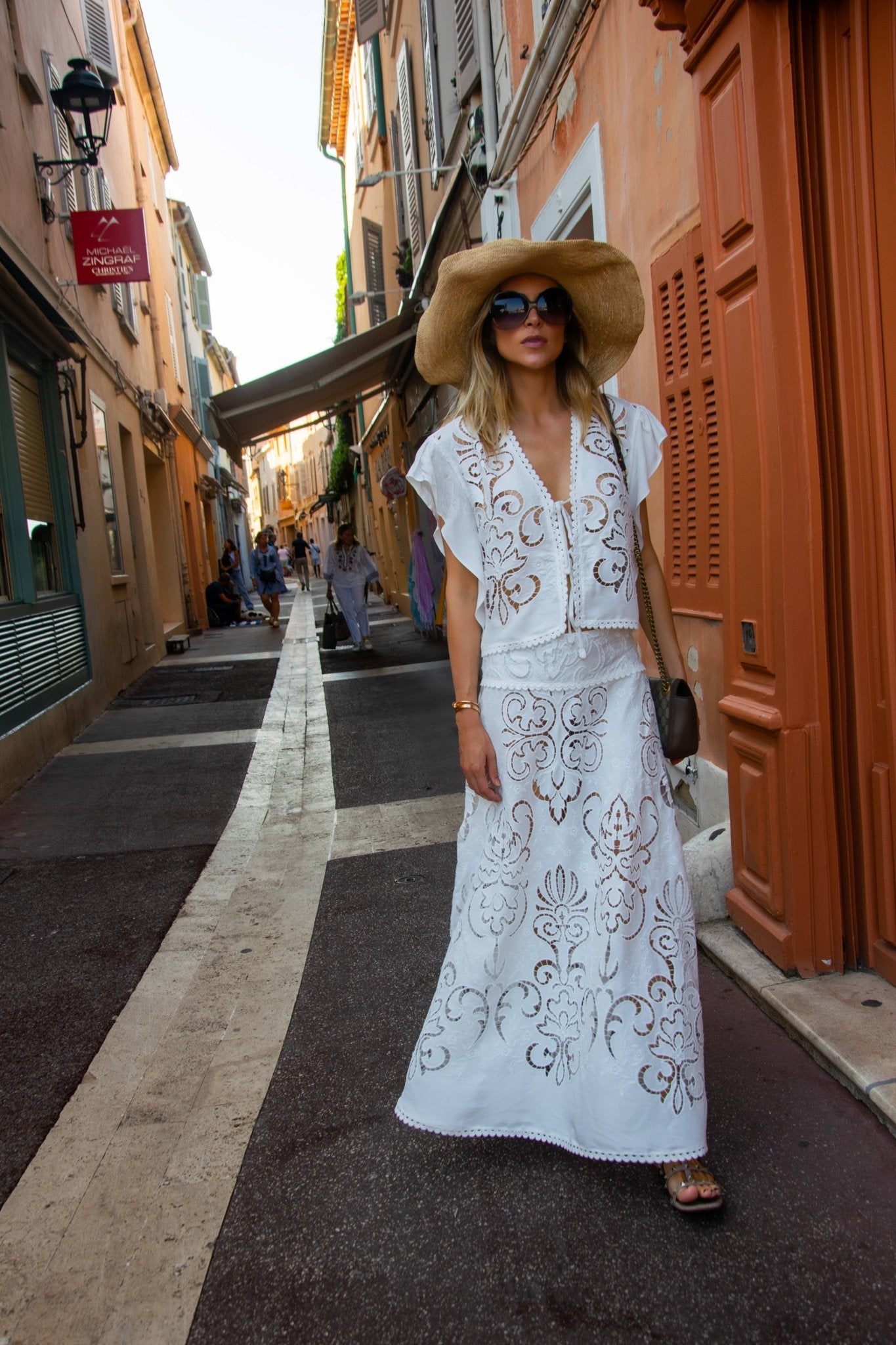 The Mia Skirt celebrates the essence of Riviera femininity — elegant, light, and timeless. Crafted from exquisite white guipure cotton, it showcases intricate openwork embroidery that catches the sunlight beautifully. Its flared, ankle-length silhouette moves gracefully, while the scalloped hem and adjustable tie belt offer both refinement and comfort. Perfect for effortless summer sophistication, from day to night.