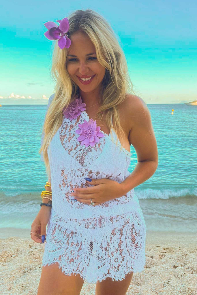 Crafted in delicate Calais lace adorned with floral embroidery along the neckline, this ethereal piece drapes beautifully over the body, revealing a subtle play of transparency.